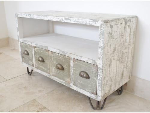 Distressed White Media Cabinet. Distressed white finish falls along the lines of shabby chic style that is trendy again these days. Rustic farmhouse style bedroom tv cabinet.